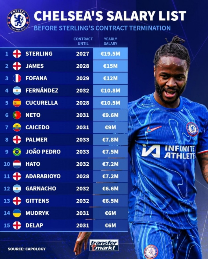 5人年薪超千万! 切尔西工资表: 刚离队的斯特林1950万欧第一